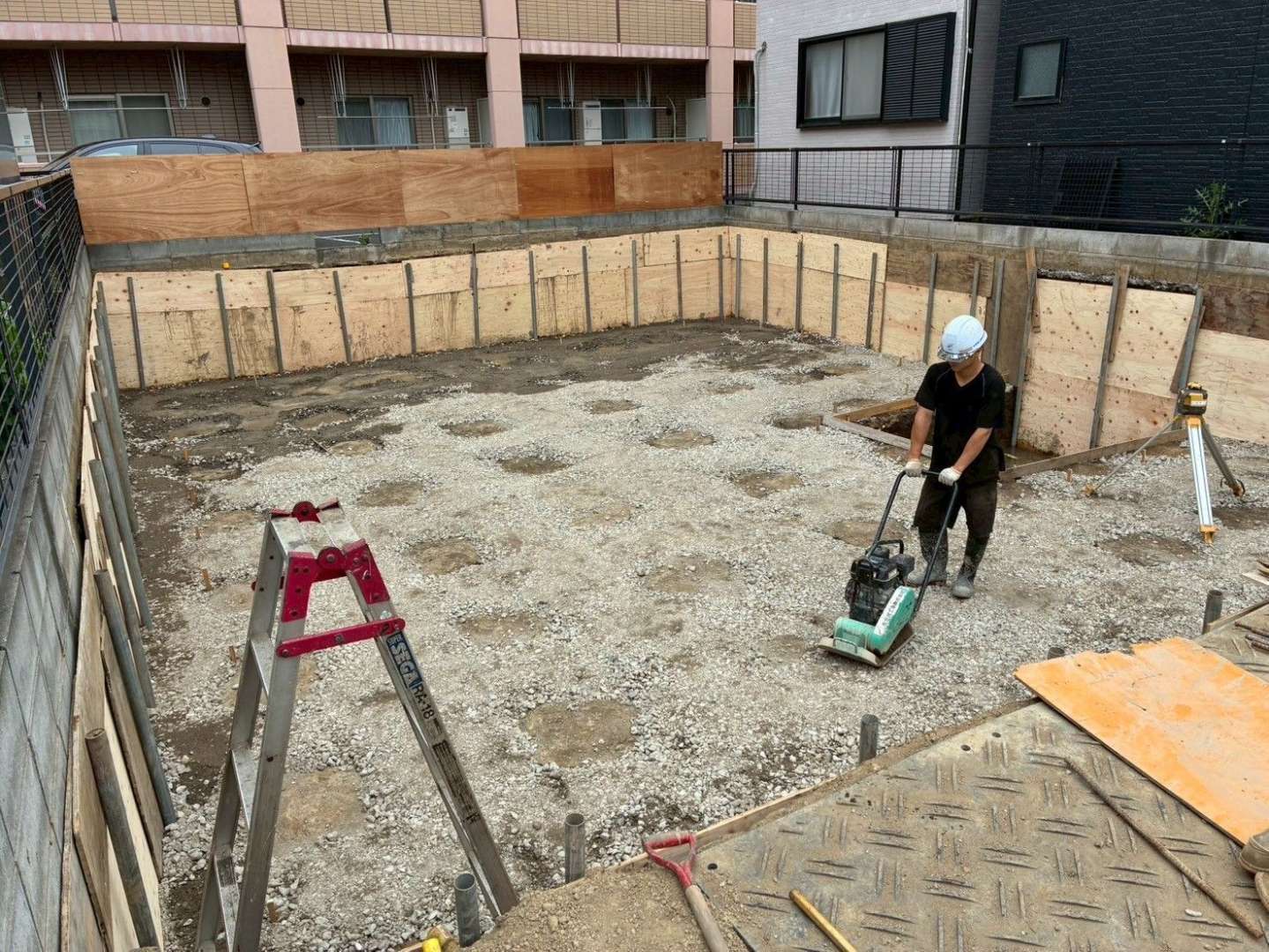 そして、掘った底に「砕石(さいせき)」という石を敷き詰め、専用の機械で転圧して、カチカチに固めます。これが弱いと、将来家が沈む原因になります。