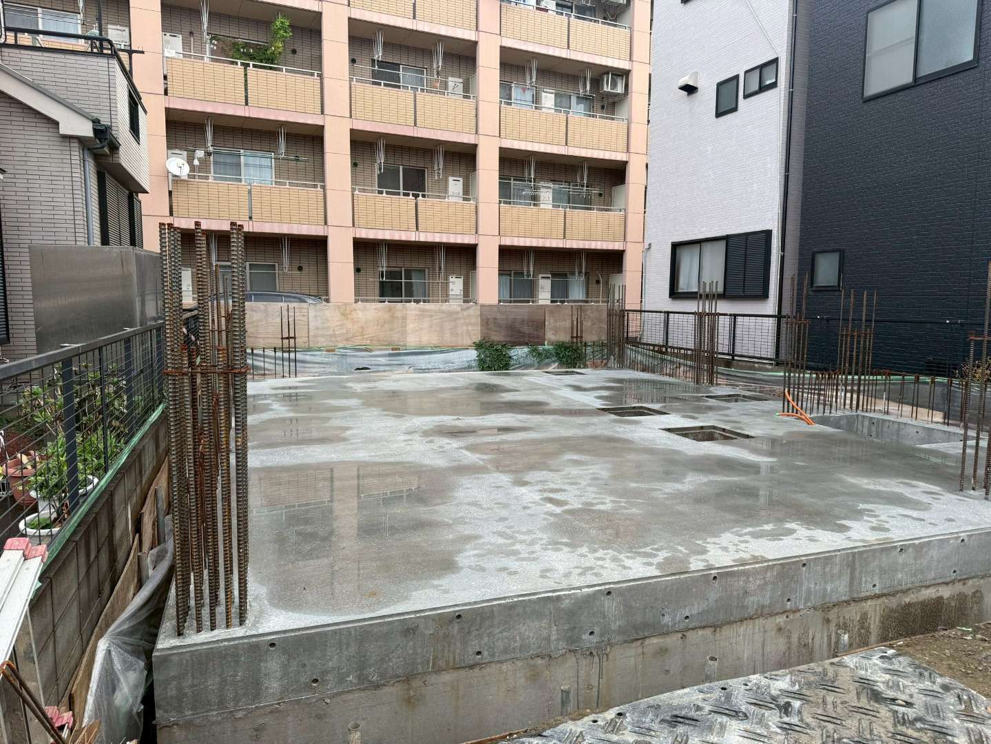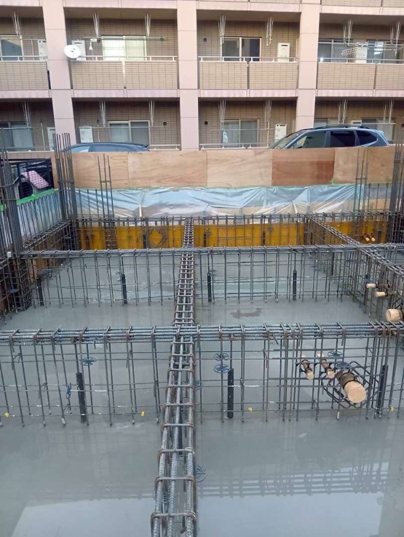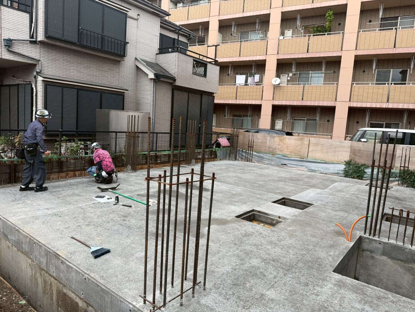 地面からの湿気を防ぐシートを敷いた後、薄くコンクリートを流します。これを「捨てコン」と言います。