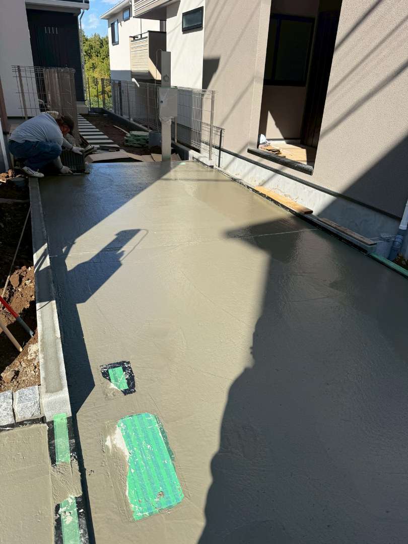 アスファルトは機械で敷き均すことが多いですが、コンクリートは「職人の手作業」で仕上げが決まります。